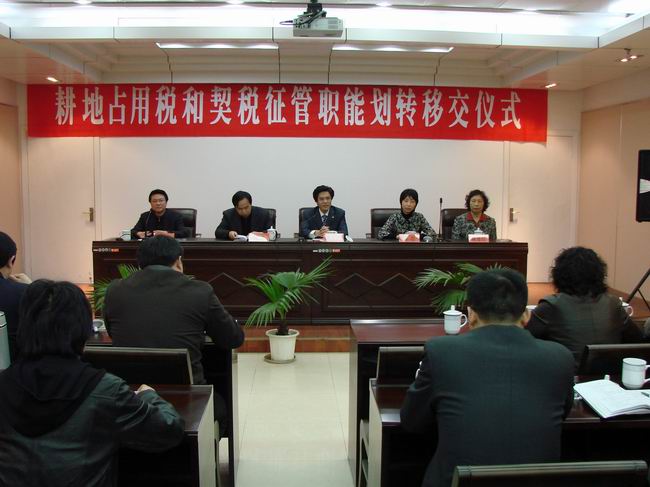 去年年底,按照省、市有关精神,市财政、地税、人事和编办四部门联合召开了工作会议,对全市两税职能划转工作作了统一部署。我局根据部署制定了市本级耕契两税职能划转实施方案,就市本级两税职能移交明确了具体要求和步骤,确保做到两税职能顺利划转,两税征管工作不断不乱,两税人员平稳过渡。交接仪式的举行,标志着两税职能正式划转地税,这有利于我市财税职能的进一步优化和实现财税部门工作科学化、精细化的管理目标。