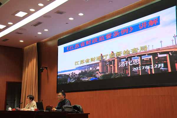 为认真学习贯彻12月1日开始施行的《江苏省财政监督条例》,市财政局于12月12日在行政中心群贤堂召开《条例》专题培训,特邀省财政厅监督检查局汤代忠副局长对《条例》进行深入解读。来自全市各部委办局、各直属单位的单位负责人和财务负责人、辖市区财政监督条线人员等参加了本次培训,市财政局助理调研员丁燕主持培训。