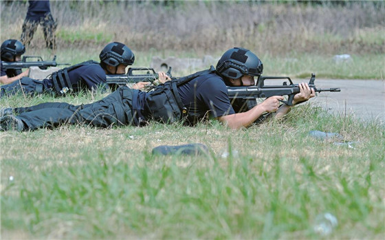 下午,武进国防园的野外训练场热闹非凡,来自全市各个辖市区分局的巡特警队员们在进行射击比赛,上午的短枪比赛后,下午进行50米长枪隐显靶射击。记者看到,选手使用的都是95突击步枪,比赛分为跪射、卧射两个姿势。
