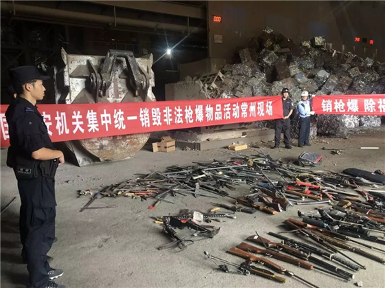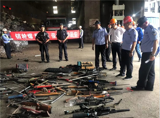 根据公安部、省公安厅的统一部署要求,8月12日下午,市公安局在中天钢铁南厂区,对今年以来收缴的800余件枪支、管制器具、仿真枪等非法枪爆物品进行集中销毁。