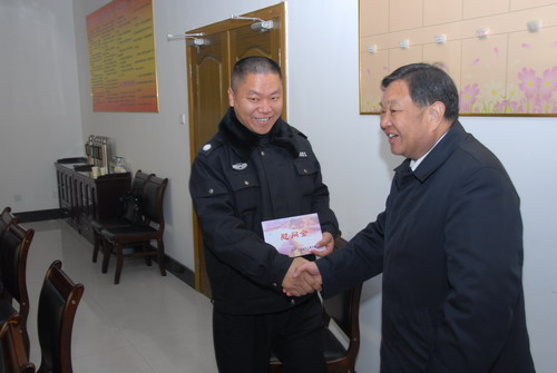 1月28日上午,省见义勇为基金会常务副理事长朱义泉一行在市见义勇为基金会理事长朱明陪同下,专程到我市武进、戚墅堰等地,亲切看望因公负伤的武进区公安局新城派出所民警李国锋、省见义勇为先进分子沈建军和常志显,向他们致以新春祝福,并颁发慰问金。市公安局副局长顾锋,武进区副区长、公安局长谢海明,戚墅堰区副区长、公安分局长韩军等陪同慰问。