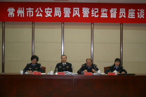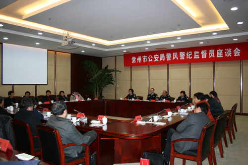 1月25日下午,市公安局在民和厅召开警风警纪监督员座谈会。副市长、公安局长尚建荣出席会议,代表市局党委和全体公安民警,感谢警风警纪监督员们长期以来对公安工作的关心和支持。市公安局党委委员、纪委书记李立建在会上通报了2009年全市公安工作和市公安局开展党风廉政建设及队伍建设情况。与会警风警纪监督员们充分肯定了去年我市公安工作取得的可喜成绩,并对进一步提升网控管理、推进和谐爱民工程、做好老小区改建、加强交通管理等方面提出了意见和建议。市公安局党委委员、政治部主任孙菡以及市公安局纪委班子成员参加座谈会。