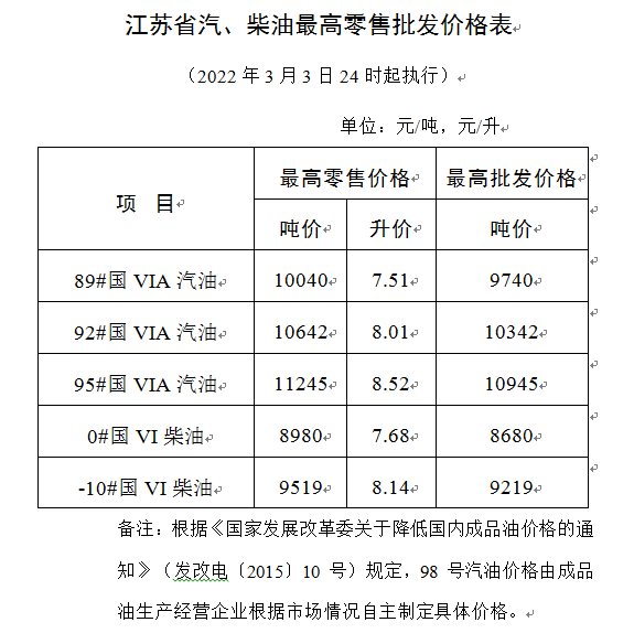 根据国家发展改革委公布的国内成品油价格调价信息,现将我省汽、柴油最高零售、批发价格公布如下,自2022年3月3日24时起执行。