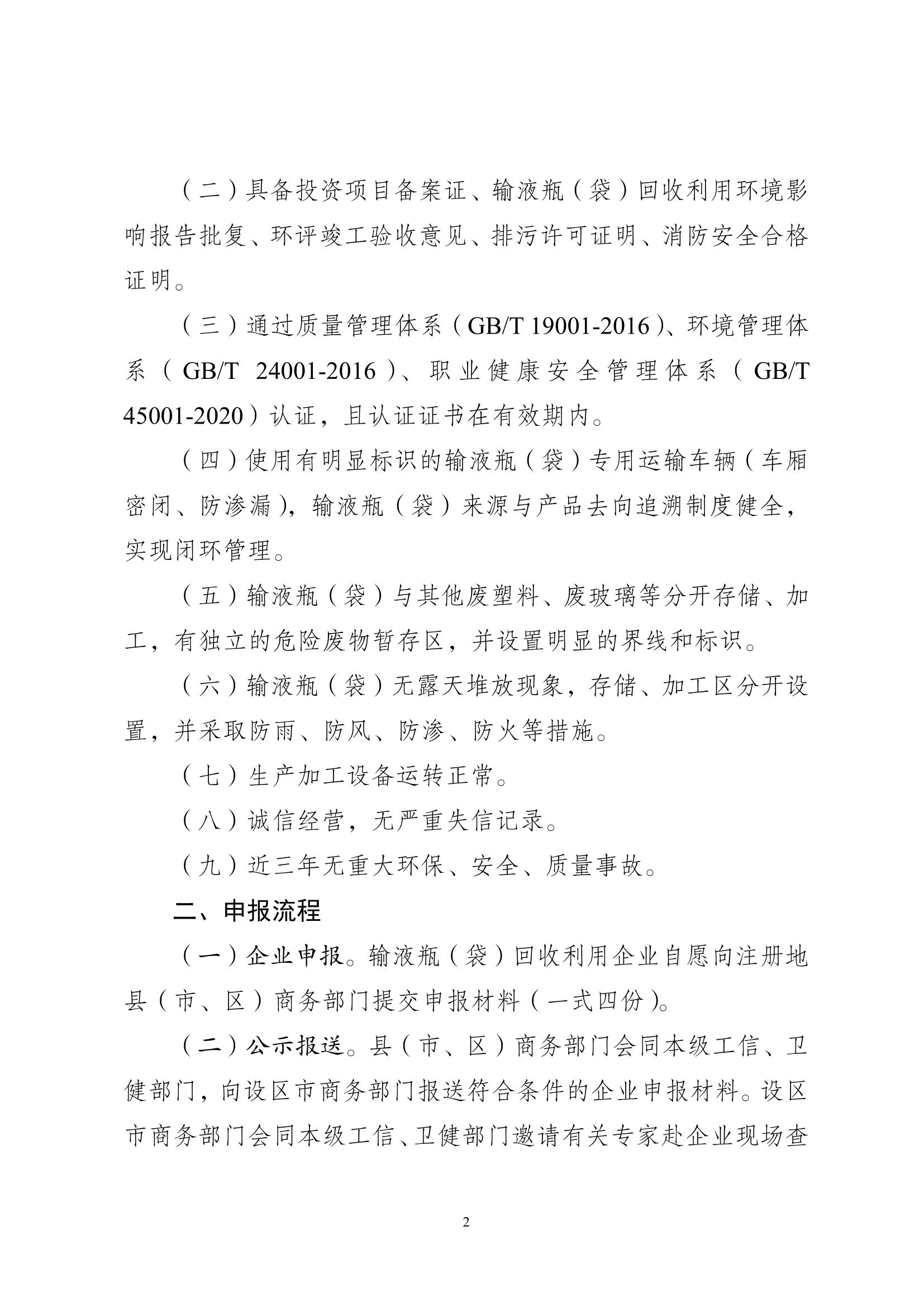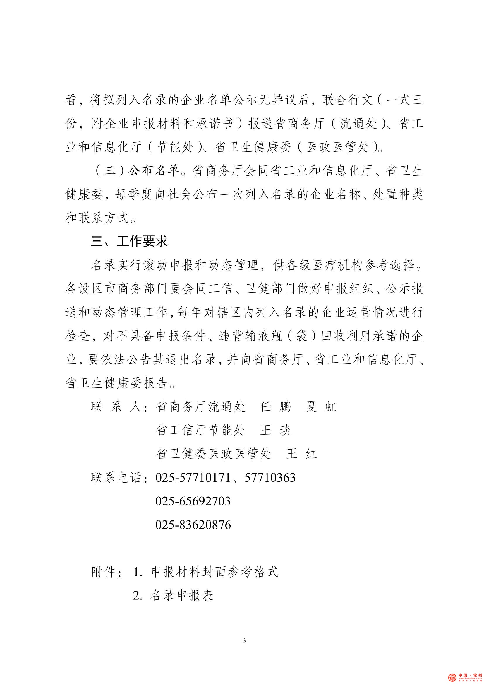 | 内容概述:转发省商务厅 省工业和信息化厅 省卫生健康委关于做好江苏省输液瓶(袋)回收利用企业名录申报工作的通知 |