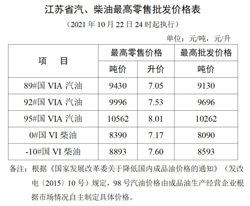 根据国家发展改革委公布的国内成品油价格调价信息,现将我省汽、柴油最高零售、批发价格公布如下,自2021年10月22日24时起执行。