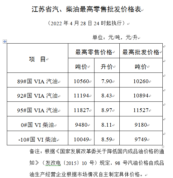 根据国家发展改革委公布的国内成品油价格调价信息,现将我省汽、柴油最高零售、批发价格公布如下,自2022年4月28日24时起执行。