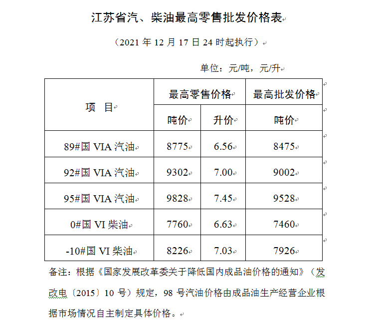 根据国家发展改革委公布的国内成品油价格调价信息,现将我省汽、柴油最高零售、批发价格公布如下,自2021年12月17日24时起执行。