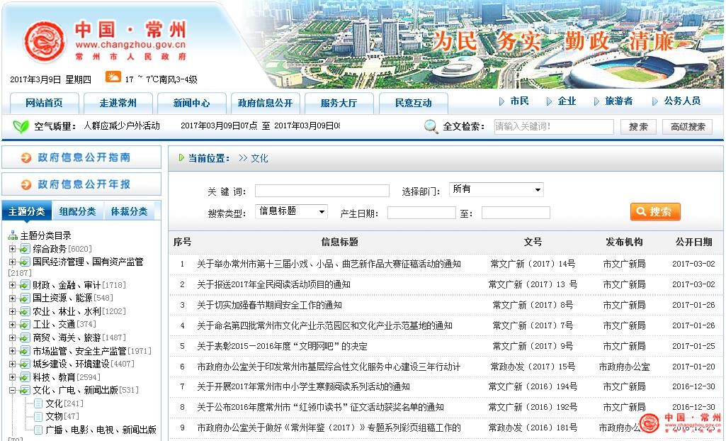 三是突出公开重点。通过推进政府信息公开,监督和制约权力的运行,防止暗箱操作,将行政许可、办事职责、办事程序向社会公开。除利用市政府统一网站平台外,还积极利用文化常州网站做好信息发布工作,有效提升市民对文化广电新闻出版局的认可度和满意度。