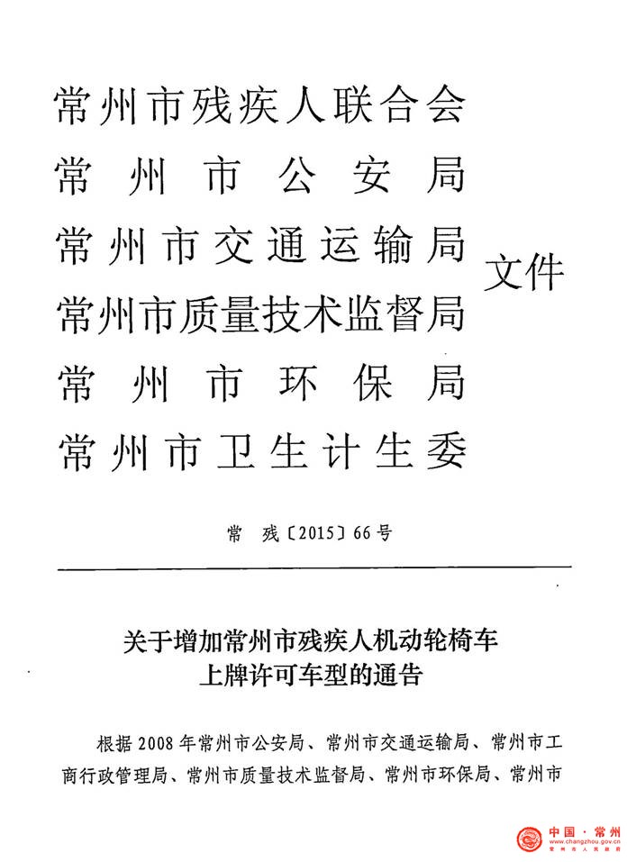 | 信息名称:关于增加常州市残疾人机动轮椅车上牌许可车型的通告 |