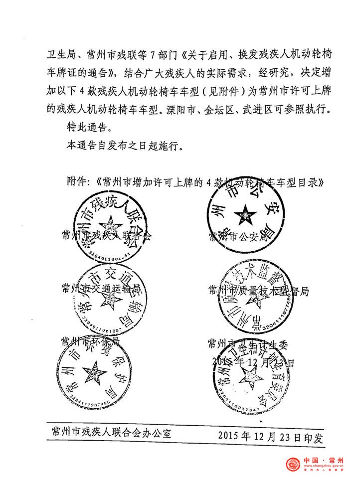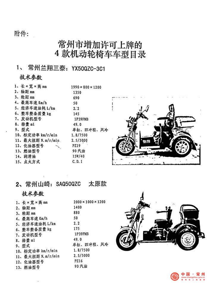 | 内容概述:根据2008年常州市公安局、常州市交通运输局、常州市工商行政管理局、常州市质量技术监督局、常州市环保局、常州市卫生局、常州市残联等7部门《关于启用、换发残疾人机动轮椅车牌证的通告》,结合广大残疾人的实际需求,经研究,决定增加以下4款残疾人机动轮椅车车型(见附件)为常州市许可上牌的残疾人机动轮椅车车型。 |