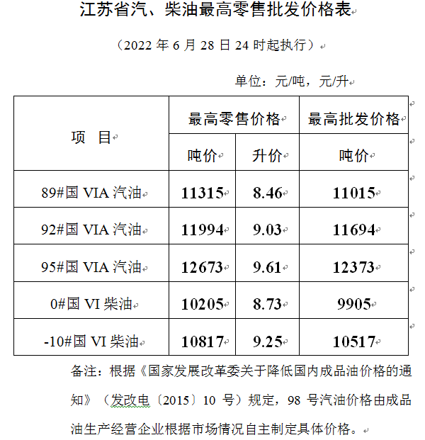根据国家发展改革委公布的国内成品油价格调价信息,现将我省汽、柴油最高零售、批发价格公布如下,自2022年6月28日24时起执行。