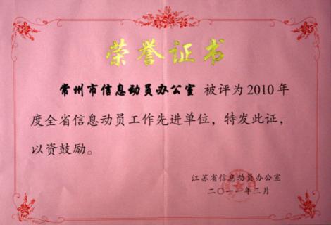 3月3日,2011年度省国防信息动员工作会议在南京召开。会议传达了省国动委第十四次会议精神,通报了2010年全省信息动员工作情况,并表彰了2010年度工作先进。我市信动办被评为全省信息动员工作先进单位。