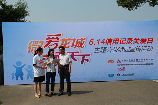 6月14日,全国第9个信用记录关爱日,全市金融机构的代表和市信用管理示范企业、诚信示范企业代表,携手“一加爱心社”志愿者及残疾人,在青枫公园举行“珍爱信用记录,享受幸福人生”大型主题公益游园宣传活动。