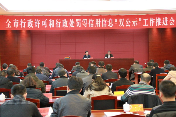 3月10日,我市召开全市行政许可和行政处罚等信用信息“双公示”工作推进会,具有行政许可和行政处罚职能的53家市级部门和单位的分管负责同志及相关处室负责人,各辖市(区)人民政府办公室分管副主任、经信委(经发局)分管领导及信用办负责同志参会。市政府副秘书长周庆到会并讲话,市经信委副主任潘仁贤主持会议。
