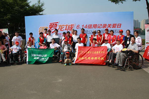 6月14日,全国第9个信用记录关爱日,全市金融机构的代表和市信用管理示范企业、诚信示范企业代表,携手“一加爱心社”志愿者及残疾人,在青枫公园举行“珍爱信用记录,享受幸福人生”大型主题公益游园宣传活动。