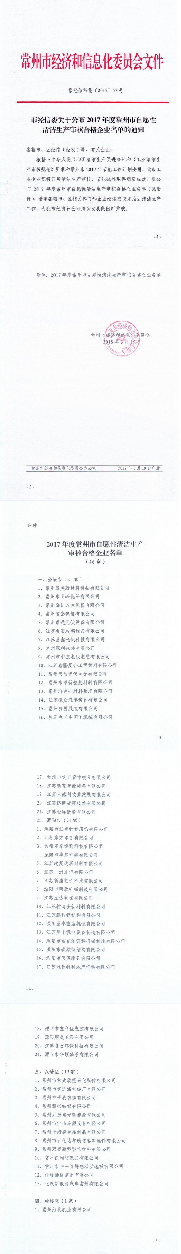 关于公布2017年度常州市自愿性清洁生产审核合格企业名单的通知