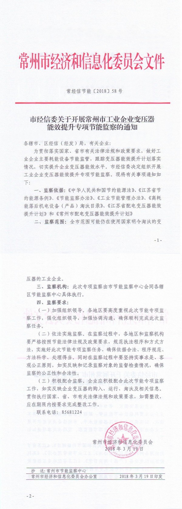 关于开展常州市工业企业变压器能效提升专项节能监察的通知
