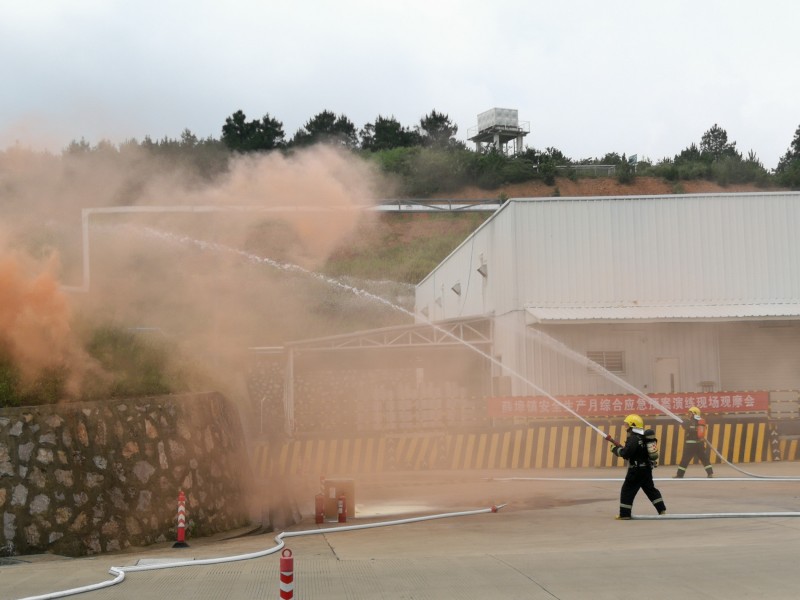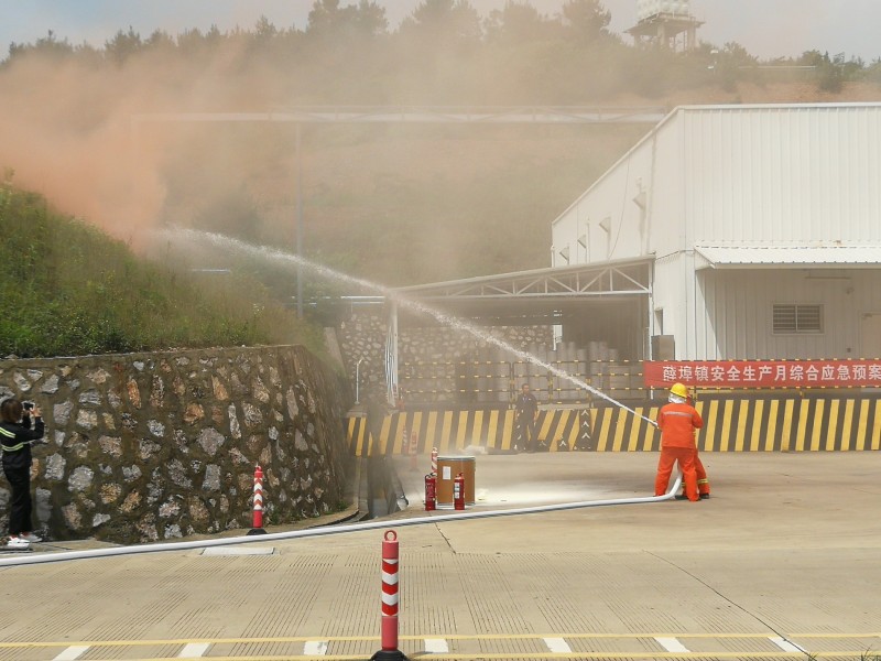 演练模拟民爆库区附近发生冒烟起火事故,现场人员立即报告并报警,在人工手提灭火器和消防栓接通水带灭火均未成功之际,消防车、救护车立即赶到,成功灭火,受伤人员也立该得到转运救治。从发现火情报告,灭火救援、伤员救护,到灭火后检查有无复燃可能,整个演练有条不紊地进行。演练结束时还进行了演练现场总结和评估,并进行了安全生产教育。