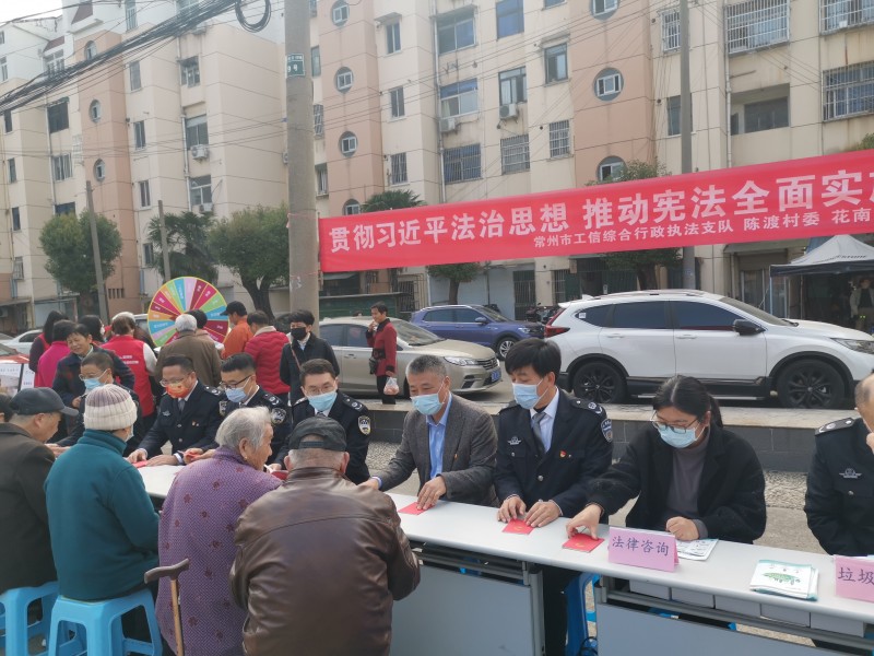 上午,支队全体党员来到陈渡村委花南社区的广场,在现场为社区发放了《中华人民共和国宪法》及《行政处罚法》法律读本,以及印有与宪法精神相关字样的宣传毛巾、垃圾袋、节能灯等生活用品。以现场答疑的形式为居民详细讲解与其生活相关的宪法内容和学习宪法的重要意义,扩大宪法宣传的影响力。