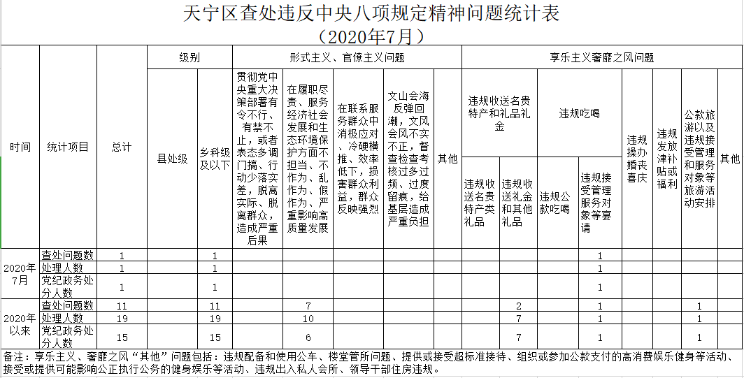 为贯彻落实中央八项规定精神,天宁区纪委监委建立了落实中央八项规定精神情况月报制度,每月定期向社会发布全区查处“四风”问题情况,释放落实中央八项规定精神越往后盯得越紧、执纪越严的强烈信号,推动党风政风和社会风气持续好转。2020年7月,全区查处违反中央八项规定精神问题情况如下: