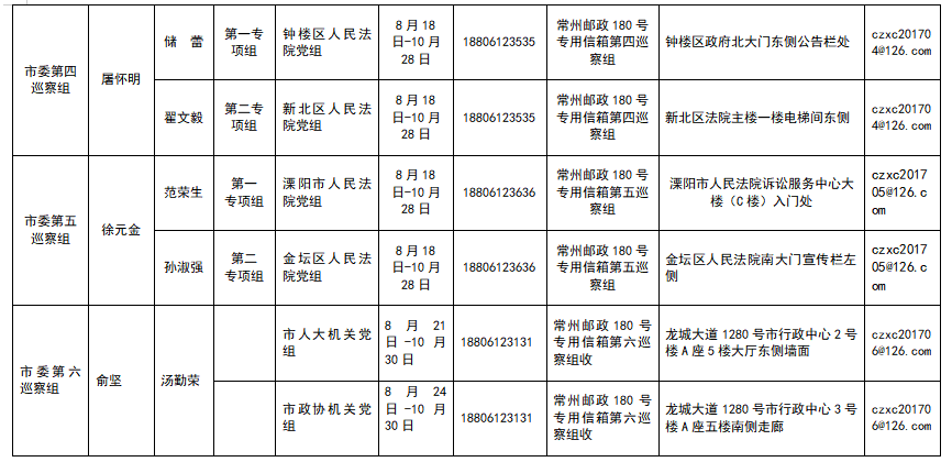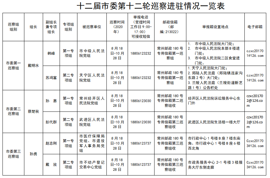 日前,十二届市委第十二轮巡察陆续完成进驻。本轮巡察将对市人大机关党组、市政协机关党组、市中级人民法院党组、市医疗保障局党组、退役军人事务局党组和不动产登记交易中心党组开展常规巡察,对溧阳市人民法院党组、金坛区人民法院党组、武进区人民法院党组、新北区人民法院党组、天宁区人民法院党组、钟楼区人民法院党组、常州经开区人民法院党组开展提级巡察。