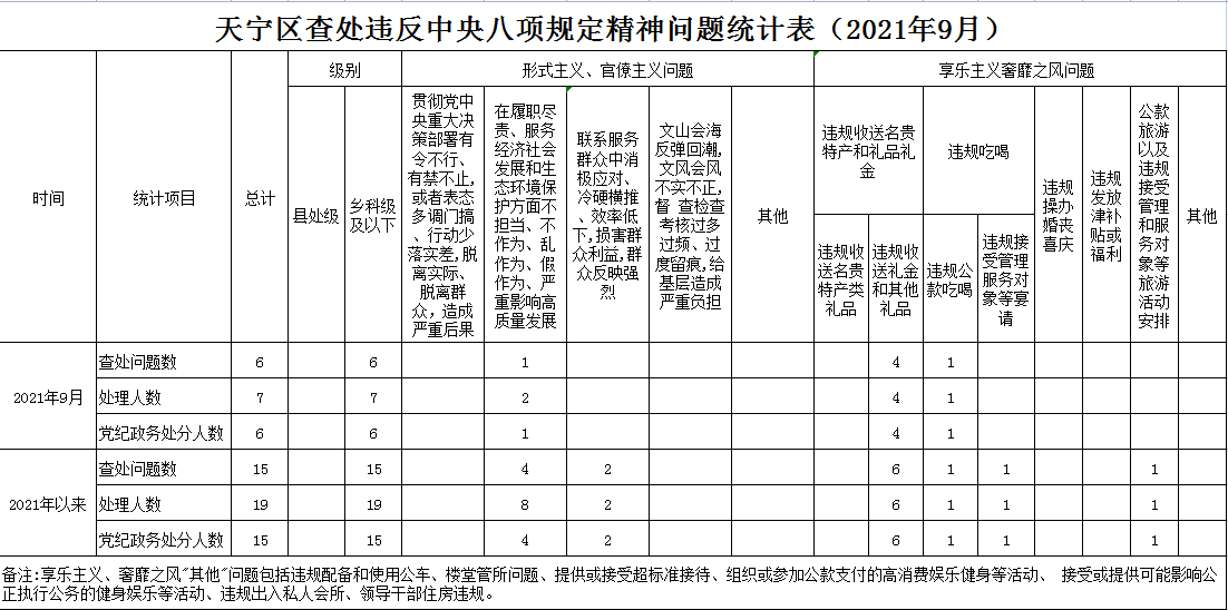 为贯彻落实中央八项规定精神,天宁区纪委监委建立了落实中央八项规定精神情况月报制度,每月定期向社会发布全区查处“四风”问题情况,释放落实中央八项规定精神越往后盯得越紧、执纪越严的强烈信号,推动党风政风和社会风气持续好转。2021年9月,全区查处违反中央八项规定精神问题情况如下: