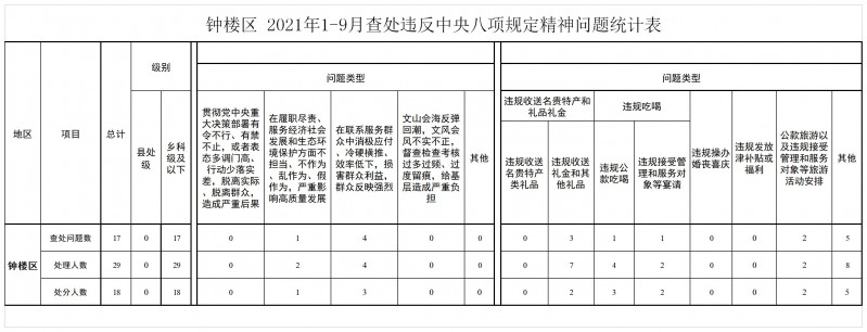 钟楼区 2021年1-9月查处违反中央八项规定精神问题17起