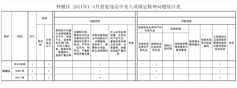 钟楼区 2021年1-3月查处违反中央八项规定精神问题4起