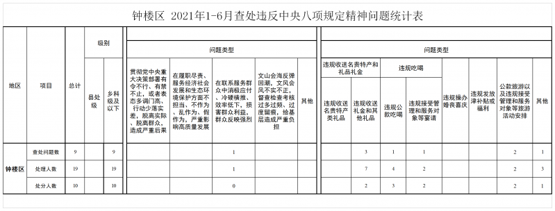 钟楼区 2021年1-6月查处违反中央八项规定精神问题9起