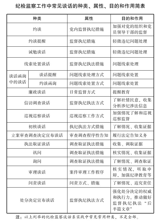 纪检监察谈话适用于纪检监察工作各个环节和各个阶段,应当根据谈话的内涵性质、对象任务、程序方式、效力后果等方面的规定和要求加以区别使用,做到既要注意党的纪律检查和国家监察之间职权措施趋同的一面,又要注意两者的区别,更要注意加强纪检监察职权措施有机结合、有效运用、叠加发力,推进纪法有效衔接,实行纪法贯通、一体运行,形成高标准要求、高水平监督、高质量发展的纪法合力,切实增强监督执纪执法实际效果。