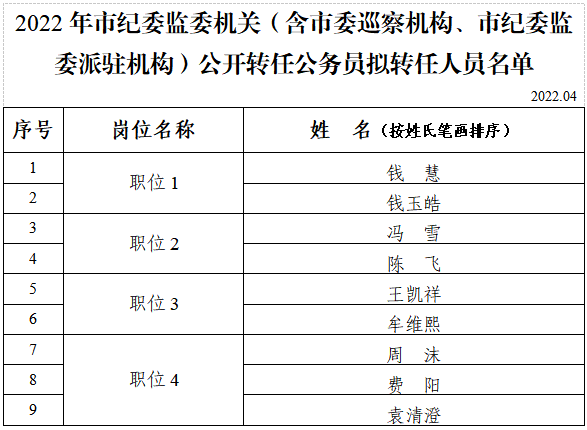 根据《市纪委监委机关(含市委巡察机构、市纪委监委派驻机构)公开转任公务员公告》,经资格初审、笔试、资格复审、面试、体检和考察等环节,现将拟转任人员予以公示(名单见附件)。