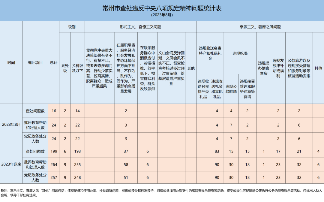 2023年8月,常州市各级纪检监察机关共查处违反中央八项规定精神问题16起,批评教育帮助和处理24人,其中给予党纪政务处分24人。从问题类型看,查处形式主义、官僚主义问题2起、批评教育帮助和处理3人,查处享乐主义、奢靡之风问题14起、批评教育帮助和处理21人。从人员级别看,批评教育帮助和处理县处级干部2人,乡科级及以下人员22人。