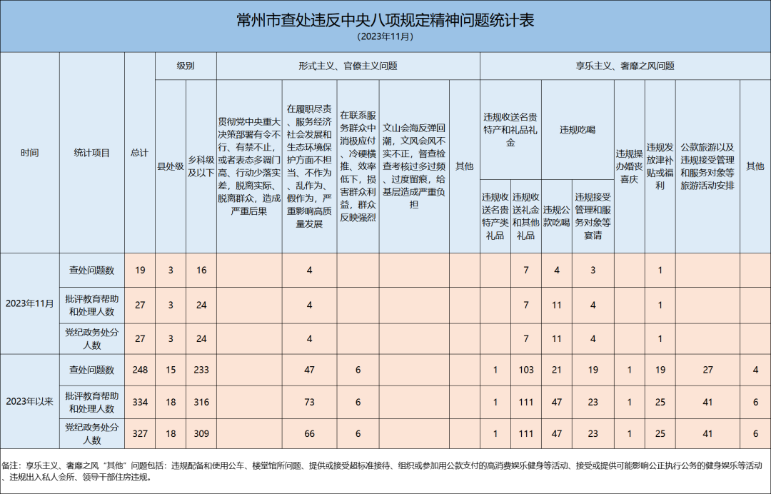 2023年11月,常州市各级纪检监察机关共查处违反中央八项规定精神问题19起,批评教育帮助和处理27人,其中给予党纪政务处分27人。从问题类型看,查处形式主义、官僚主义问题4起、批评教育帮助和处理4人,查处享乐主义、奢靡之风问题15起、批评教育帮助和处理23人。从人员级别看,批评教育帮助和处理县处级干部3人,乡科级及以下人员24人。