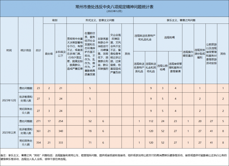2023年12月,全市各级纪检监察机关共查处违反中央八项规定精神问题23起,批评教育和处理27人,其中给予党纪政务处分27人。从问题类型看,查处形式主义、官僚主义问题5起,批评教育和处理5人;查处享乐主义、奢靡之风问题18起,批评教育和处理22人。从人员级别看,批评教育和处理县处级干部3人,乡科级及以下人员24人。