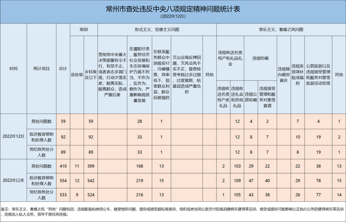 2022年12月,常州市各级纪检监察机关共查处违反中央八项规定精神问题59起,批评教育帮助和处理92人,其中给予党纪政务处分89人。从问题类型看,查处形式主义、官僚主义问题29起、批评教育帮助和处理34人,查处享乐主义、奢靡之风问题30起、批评教育帮助和处理58人。从人员级别看,批评教育帮助和处理乡科级及以下人员92人。