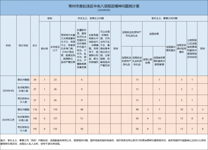 2024年4月,全市各级纪检监察机关共查处违反中央八项规定精神问题24起,其中查处形式主义、官僚主义问题6起,查处享乐主义、奢靡之风问题18起;批评教育和处理27人,均给予党纪政务处分。从人员级别看,批评教育和处理县处级干部1人,乡科级及以下人员26人。