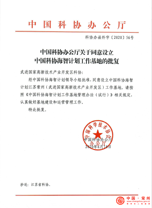 近日,经中国科协海智计划领导小组批准,同意设立中国科协海智计划江苏常州(武进国家高新技术产业开发区)工作基地。