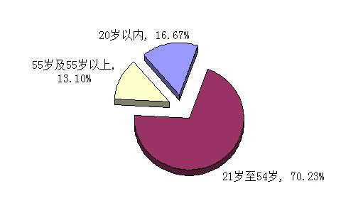 2、参加问卷调查的人群中20岁以内的占16.67%,21岁至54岁的占70.23%,55岁及55岁以上的占13.1%。