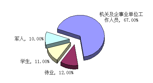 3、参加问卷调查的人群中机关及企事业单位工作人员占67%,待业、学生和军人分别为12%、11%、10%。