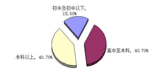 4、参加问卷调查的人群中初中及初中以下的占18.6%,高中至本科的占40.7%,本科以上的占40.70%。