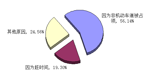 8、参加问卷调查的人群中因为非机动车道被占领而占领机动车道的占56.14%,因为赶时间的占19.3%,其他原因的占24.56%。