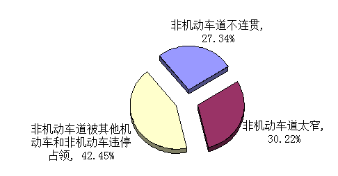 在非机动车车道设置方面,觉得现有非机动车车道的设置合理的占50%,觉得不合理的占50%;认为机动车道与非机动车道之间的防护措施较为完善的占21.11%,认为部分完善仍有不足的占46.67%,认为大多数不完善须加强建设的占32.22%。
