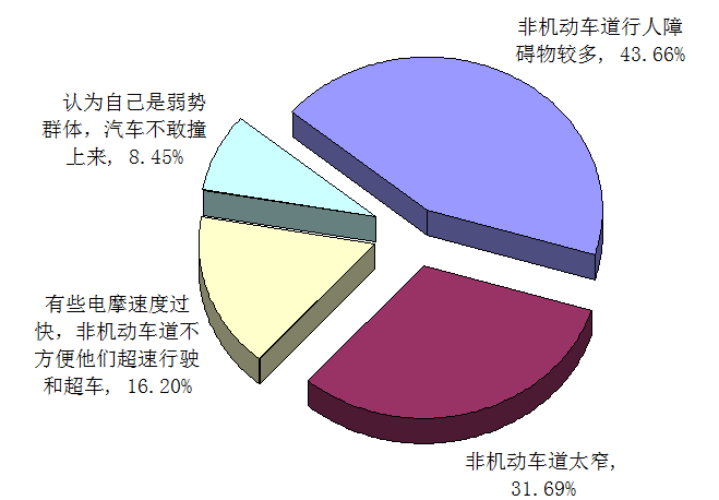 13、参加问卷调查的人群中认为非机动车占用机动车车道的主要原因是非机动车道行人障碍物较多,其次是非机动车道太窄等。