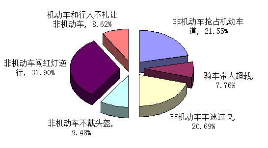 参加问卷调查的人群中偶尔骑行非机动车的人占43.18%,经常骑行的占40.91%,从不骑行的占15.91%;有非机动车占领车道经历的占72.37%,没有的占27.63%;其中因为非机动车道被占领而占领机动车道的占56.14%,因为赶时间的占19.3%,其他原因的占24.56%。绝大多数的被调查人员都知道非机动车占领机动车道是违反交通规则的行为。参与调查的人群中见到过非机动车不文明现象中以闯红灯、逆行、非机动车上机动车道的现象尤为明显。