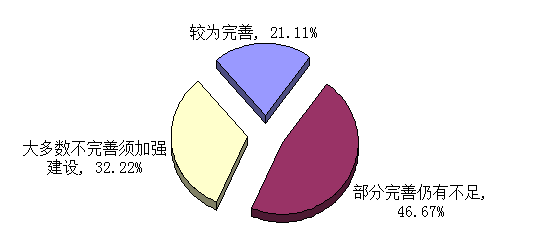 16、参加问卷调查的人群中认为机动车道与非机动车道之间的防护措施较为完善的占21.11%,认为部分完善仍有不足的占46.67%,认为大多数不完善须加强建设的占32.22%。