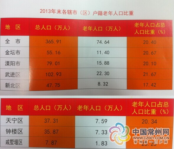 2013年末,各辖市(区)60周岁及以上户籍人口占该辖市(区)总人口比重前三位的是戚墅堰区、武进区和金坛市,分别为23.25%、21.67%和20.67%。