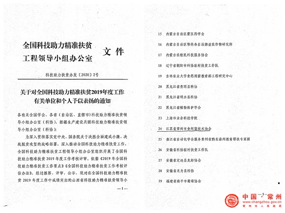 为深入贯彻落实党中央、国务院关于决胜全面建成小康、决战脱贫攻坚的战略部署,深入推动全国科技助力精准扶贫工作,全国科技助力精准扶贫工程领导小组办公室组织开展了全国科技助力精准扶贫2019年度工作考核评审。由常州市农村专业技术协会推荐的市农技协常务理事单位:常州市食用菌技术协会,在全国科技助力精准扶贫工作中,措施有效,成绩突出,被评为“全国科技助力精准扶贫2019年度先进团队”,也是江苏省唯一获奖单位。
