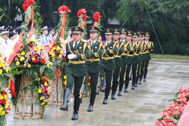 方阵前,市委、市人大常委会、市政府、市政协及参加仪式的社会各界代表敬献的10个大型花篮一字排开。花篮红色缎带上书写着“烈士永垂不朽”的金色大字。