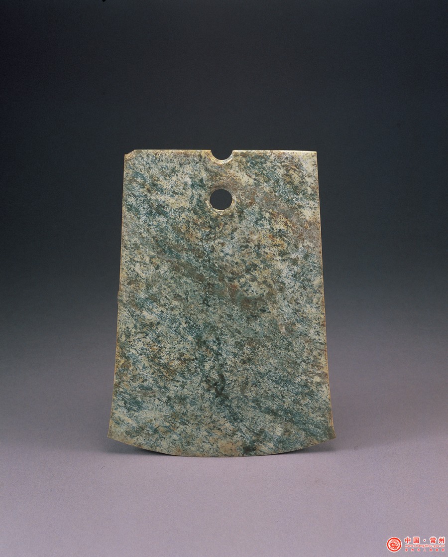 这件玉钺出土于武进寺墩遗址。玉钺刃部两侧外撇,造型呈“风”字形,顶部有一半圆形钻孔,上部有一圆形钻孔,便于用绳索对玉钺进行捆扎固定。良渚文化时期,部落首领既是部落的军事首领,又是部落内部的宗教领袖,集军权、神权于一身,而玉钺则是这些部落首领手中的“权杖”,是一种权力的象征。根据现有的考古资料,在良渚文化时期的大型墓葬中,玉钺往往放置在比较显著的位置,此时的玉钺,已完全脱离了实用器具的范畴,成为专门的礼器。这件玉钺通体磨光,制作十分精致,其刃部光滑,无使用痕迹,故非实用器,而是墓主人生前拥有军事统帅权力的象征。