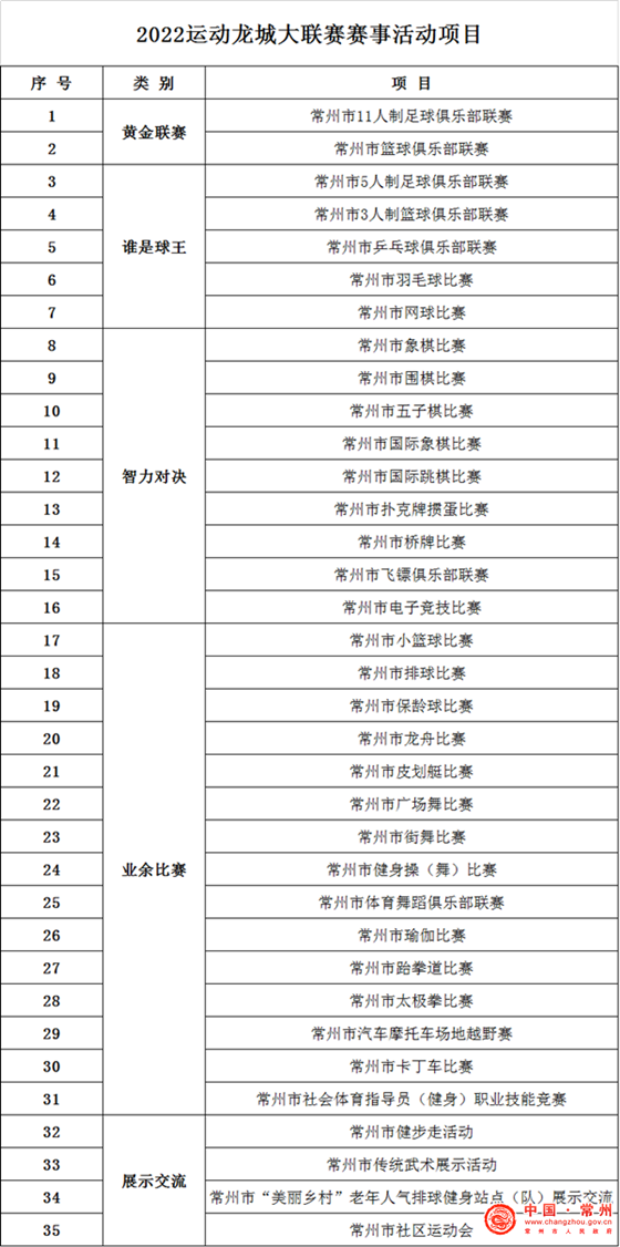 2022运动龙城大联赛增加了常州市篮球俱乐部联赛、常州市国际跳棋比赛、常州市桥牌比赛、常州市太极拳比赛4个项目;过往单一的“常州汽车越野赛”升级为“常州市汽车摩托车场地越野赛”,让这项本就充满激情的体育赛事增加了看点。此外,为适应疫情防控常态化,推动线上健身赛事活动,一些项目将采取“线上+线下”的形式,防控办赛两不误。